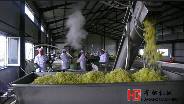將洗干凈的原料根據(jù)產(chǎn)品要求分別切成片、絲、條等形狀。預(yù)煮時,因原料不同而異,易煮透的放沸水中焯熟,不易煮透的放沸水中略煮片刻,一般燙漂時間為2~4分鐘。葉菜類不燙漂處理,設(shè)備可以用蔬菜漂燙機進行處理。