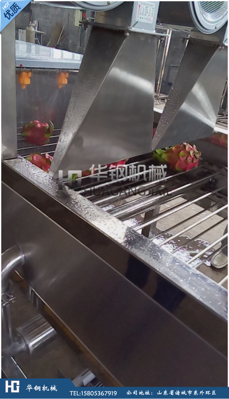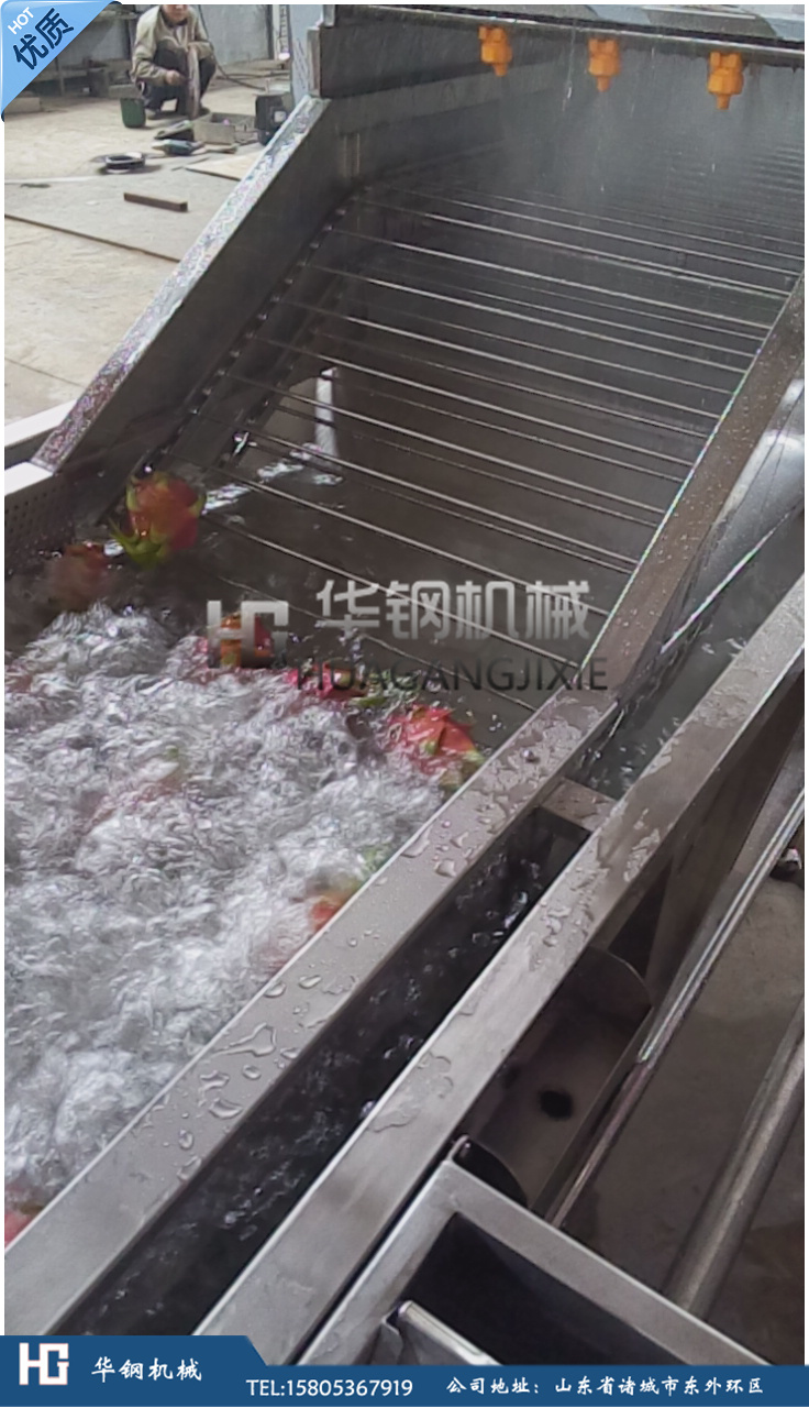 設(shè)備特點: 1.設(shè)備帶有循環(huán)水泵和過濾水箱,實現(xiàn)清洗用水循環(huán)使用,節(jié)約用水,根據(jù)實際生產(chǎn)情況補充更換新水 越南火龍果清洗加風(fēng)干包裝流水線【15805367919】