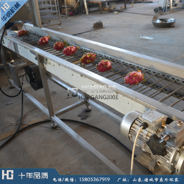 2.設(shè)備輸送帶電機可實現(xiàn)調(diào)節(jié)變速功能,被清洗的蔬菜經(jīng)過網(wǎng)鏈輸送,自動送料,自動出料,根據(jù)生產(chǎn)需要調(diào)節(jié)輸送帶輸送速度; 越南火龍果清洗加風(fēng)干包裝流水線【15805367919】