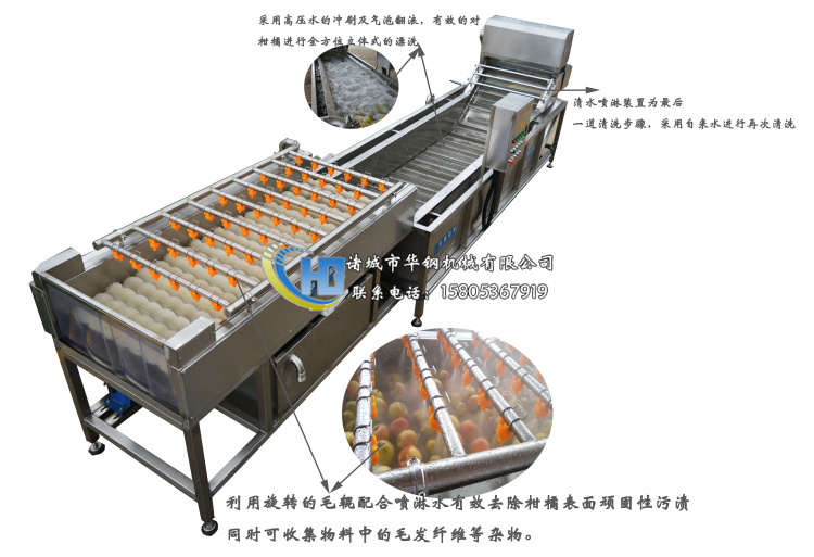 本設(shè)備是針對(duì)柑橘原料的特點(diǎn)專門設(shè)計(jì)研發(fā)而成,主體分三個(gè)清洗步驟: