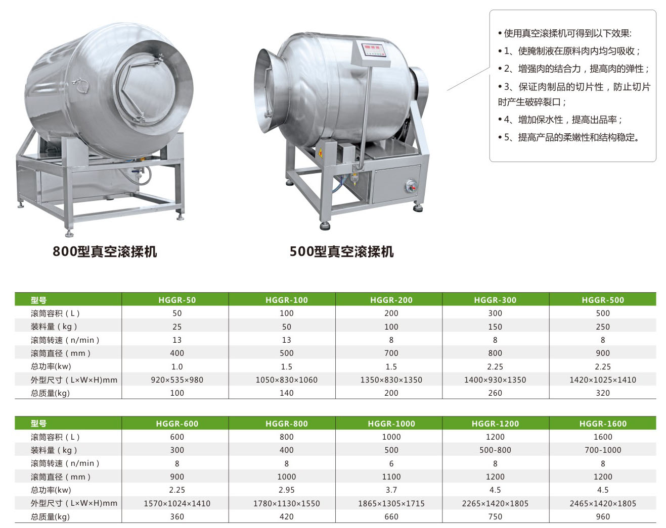 真空滾揉機(jī)整機(jī)全部采用不銹鋼制造,產(chǎn)品的結(jié)構(gòu)設(shè)計合理,操作簡單方便、便于清洗,降低了勞動成本、減輕了勞動強(qiáng)度,很大程度提高了生產(chǎn)效率,并且使用真空滾揉機(jī)加工出來的肉塊要比人工加工更加安全、衛(wèi)生。
