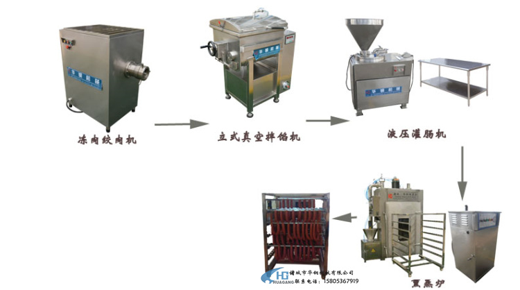 做香腸的話,主要設(shè)備有絞肉機(jī)+拌餡機(jī)+灌腸機(jī)+熏蒸爐設(shè)備。