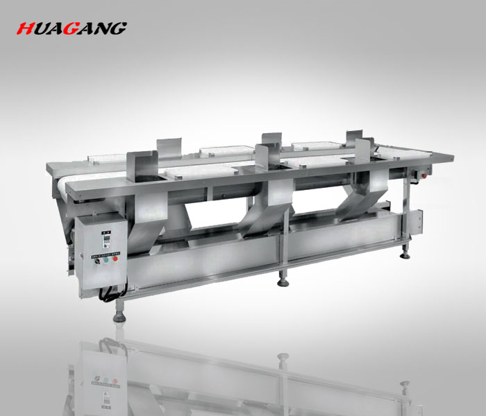 自動流水式工作臺兩邊設有工作崗位,崗位上設置砧板,廢料口,刀具存放槽。標準為三層式,原材料在中層運送,經(jīng)由工人挑選除雜后的良品放到上層; 廢品,爛菜葉,毛發(fā)等雜物通過工作臺廢料口投放到下層輸送帶運至廢品收集車(收集車需要另外定做)。