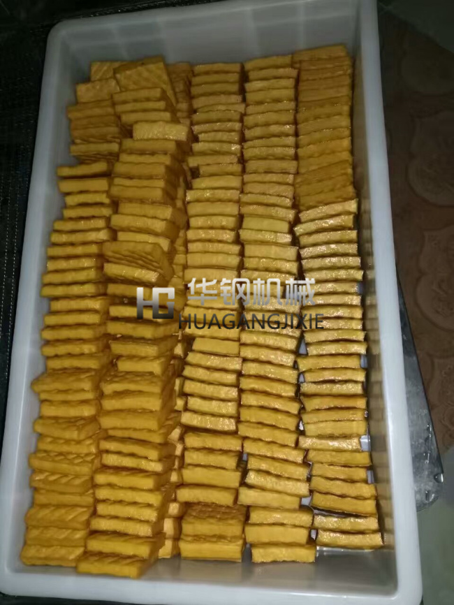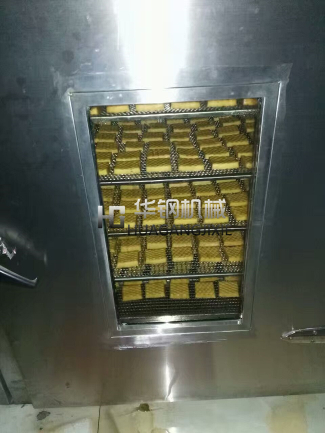 2.將放滿豆腐干的推車推到煙熏爐里面。關(guān)上爐門,通過豆干煙熏爐左側(cè)控制按鈕或者PLC電腦控制面板,設(shè)定溫度和時(shí)間,即可升溫,表皮稍微烘干后打開發(fā)煙開關(guān),煙霧即可在煙熏爐爐體內(nèi)部煙熏豆腐干。煙熏時(shí)間到后自動(dòng)報(bào)警,關(guān)閉發(fā)煙開關(guān),打開排煙開關(guān),將煙霧排到室外后,打開煙熏爐,即可看到煙熏完成的豆腐干。