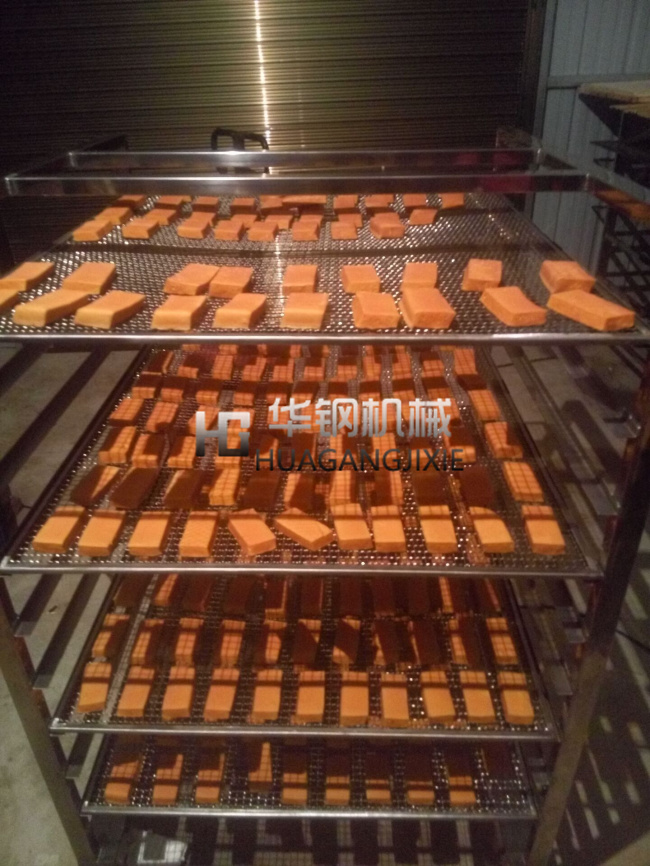 1.首先將壓好裁成塊的豆腐干放在我們提供的煙熏推車托盤上,一般煙熏推車根據(jù)型號和產(chǎn)量上面可放置6-18層不銹鋼盤子,將每層的盤子/篩子全部擺滿豆腐干。注意:每塊直接要留一公分的間隙。