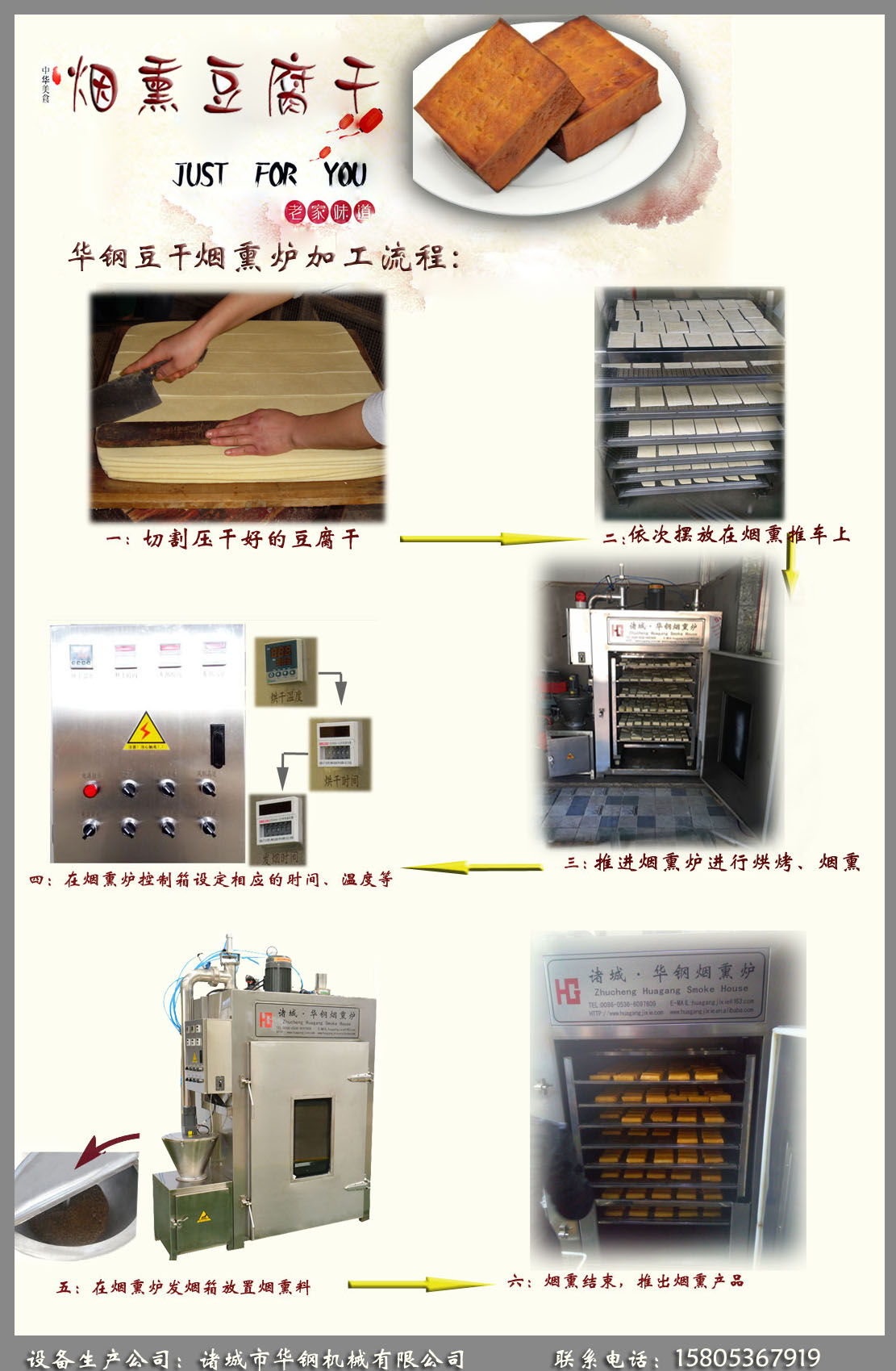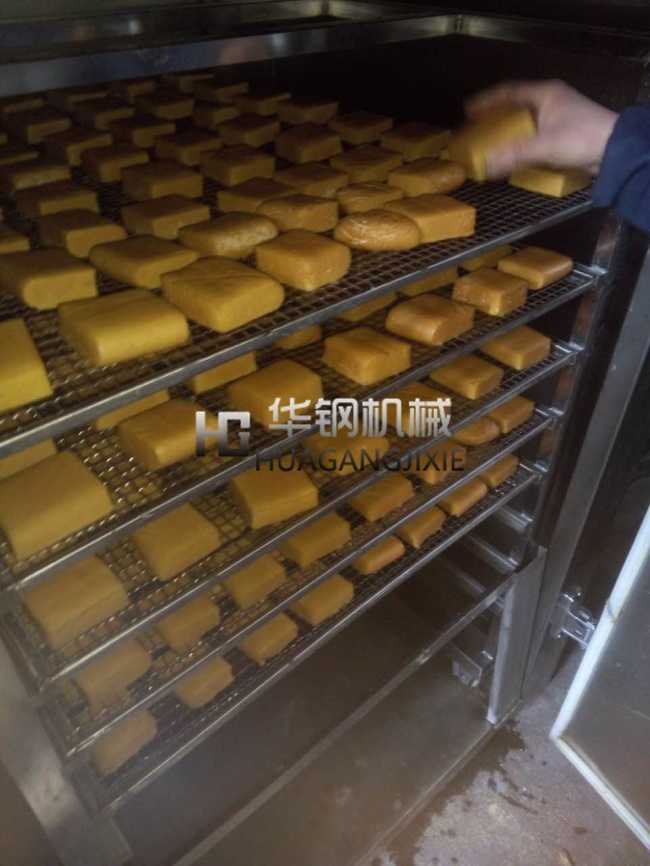 2.將放滿豆腐干的推車推到煙熏爐里面。關(guān)上爐門,通過豆干煙熏爐左側(cè)控制按鈕或者PLC電腦控制面板,設(shè)定溫度和時(shí)間,即可升溫,表皮稍微烘干后打開發(fā)煙開關(guān),煙霧即可在煙熏爐爐體內(nèi)部煙熏豆腐干。煙熏時(shí)間到后自動(dòng)報(bào)警,關(guān)閉發(fā)煙開關(guān),打開排煙開關(guān),將煙霧排到室外后,打開煙熏爐,即可看到煙熏完成的豆腐干。