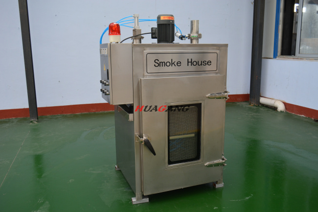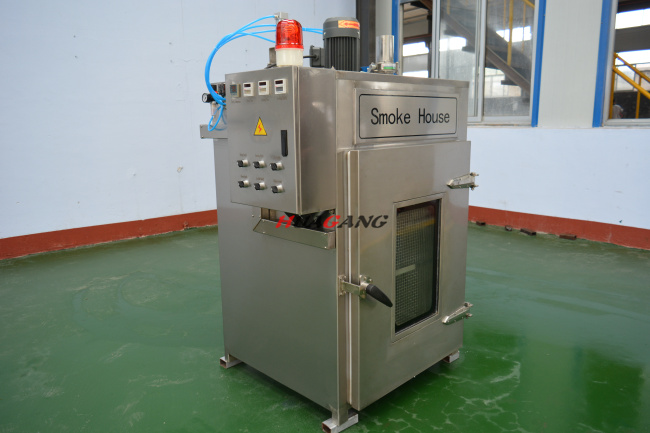 華鋼公司生產(chǎn)的HG-50煙熏爐設(shè)備一直備受廣大肉食中小企業(yè),自營店面,實(shí)驗(yàn)室等廠家的親睞。該設(shè)備不僅外觀精巧,占地面積小,無噪聲,使用方便,而且對生產(chǎn)周圍環(huán)境不會(huì)照成污染,安全性能高等優(yōu)點(diǎn)。該設(shè)備材質(zhì)全部采用SUS304不銹鋼材質(zhì)。更符合食品級要求! 該煙熏爐設(shè)備發(fā)煙裝置為標(biāo)準(zhǔn)內(nèi)置發(fā)煙,在爐體內(nèi)底部中心位置,配有高溫發(fā)煙盤裝置,在我們指定的發(fā)煙盒位置可根據(jù)客戶要求,放置 木屑,果糖,木粉,稻殼米糠等煙熏發(fā)煙產(chǎn)品,以對產(chǎn)品進(jìn)行煙熏。當(dāng)客戶的產(chǎn)品通過推車進(jìn)到煙熏爐內(nèi),關(guān)好爐門,通過左側(cè)一系列控制開關(guān),打開烘干開關(guān),發(fā)煙開關(guān)等.來滿足客戶對產(chǎn)品需求的加工生產(chǎn)。爐門裝置配有高溫雙層玻璃視窗,可看到爐體內(nèi)部產(chǎn)品上色情況等。