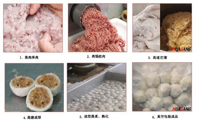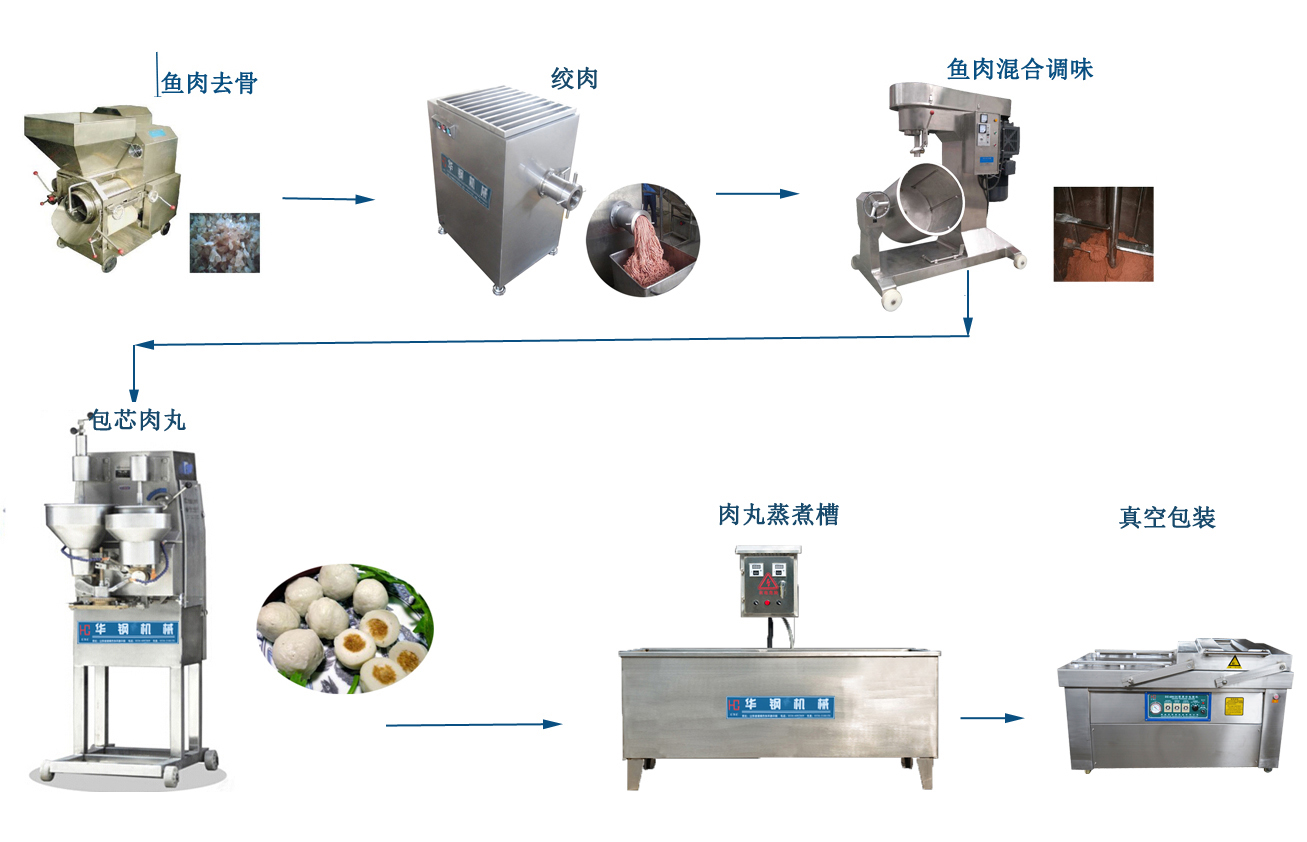 去除魚骨(魚肉采肉機(jī))→肉泥絞肉(絞肉機(jī)→與調(diào)味料混合打漿(打漿機(jī))→肉丸成型→煮沸→冷卻→包裝(冷凍產(chǎn)品)