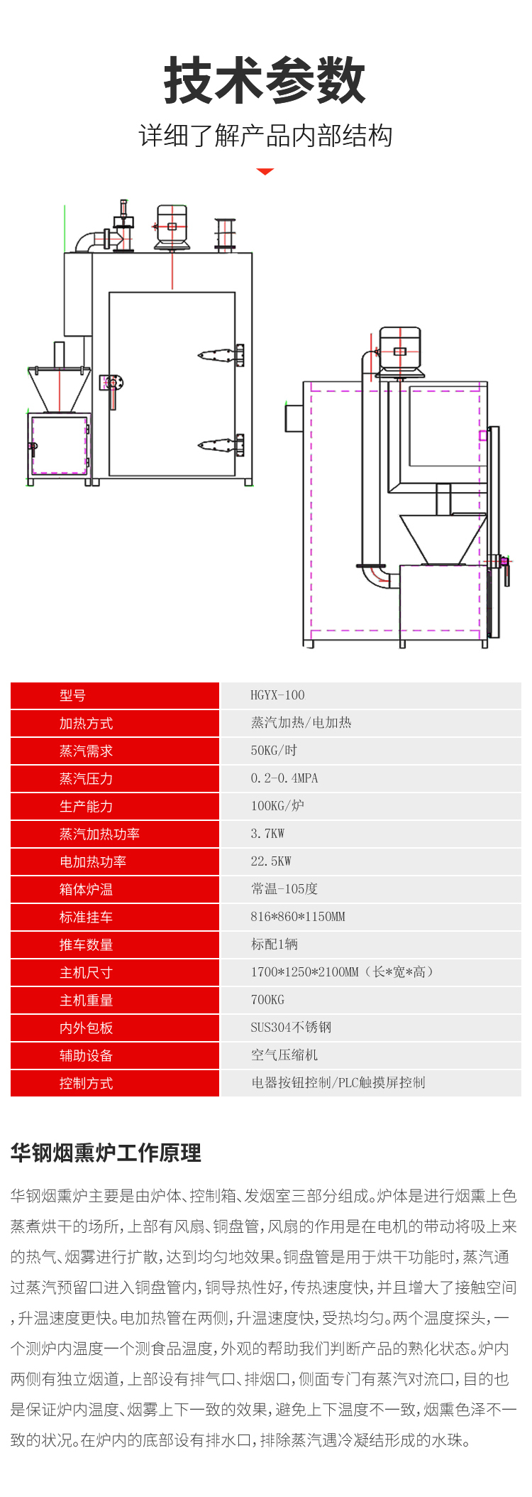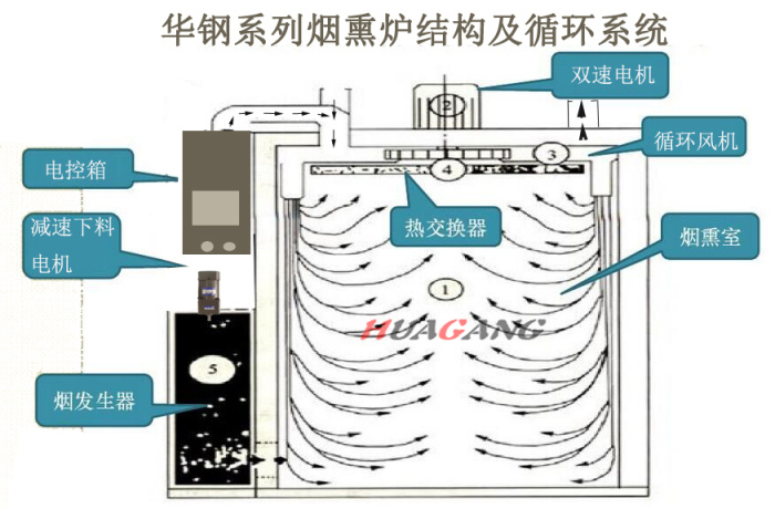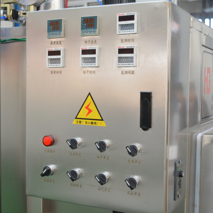 華鋼系列煙熏爐干燥、蒸煮、煙熏三工序可按設(shè)定時(shí)間自動(dòng)轉(zhuǎn)換,溫度按設(shè)定值自動(dòng)調(diào)節(jié),工序結(jié)束自動(dòng)顯示;主循環(huán)風(fēng)扇送風(fēng)均勻,使?fàn)t體內(nèi)溫度均勻,該機(jī)特別采用了雙層不銹鋼散熱器,對(duì)爐溫升溫迅速,干燥效果好,而目前國(guó)內(nèi)煙熏爐同關(guān)產(chǎn)品采用盤管式加熱器,兩者的升溫效果是無法比擬的。采用設(shè)定參數(shù)方式,通用性廣,自動(dòng)運(yùn)行中的參數(shù)可修正。