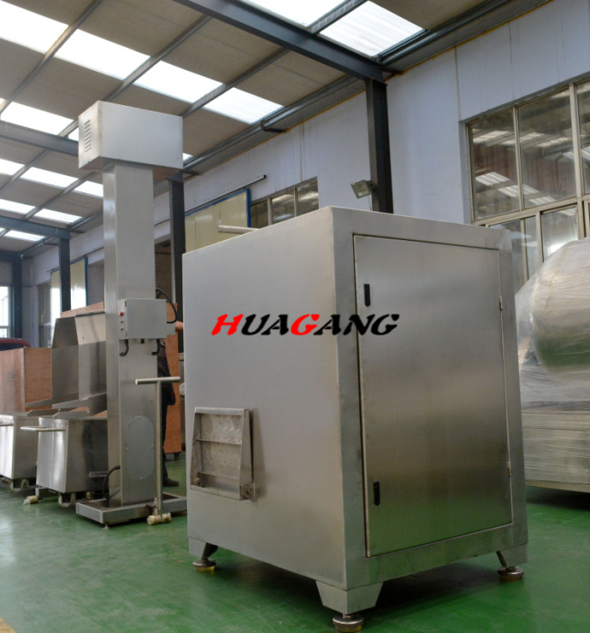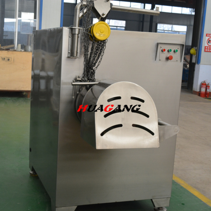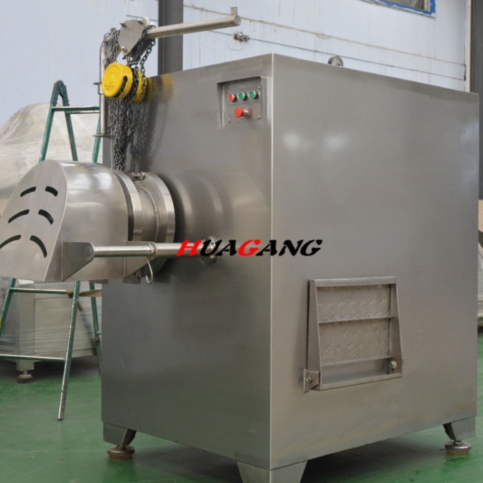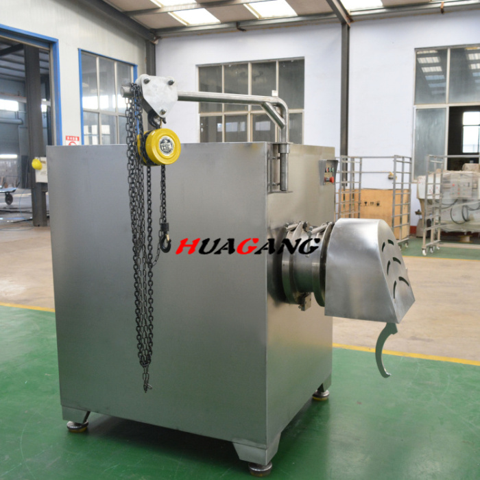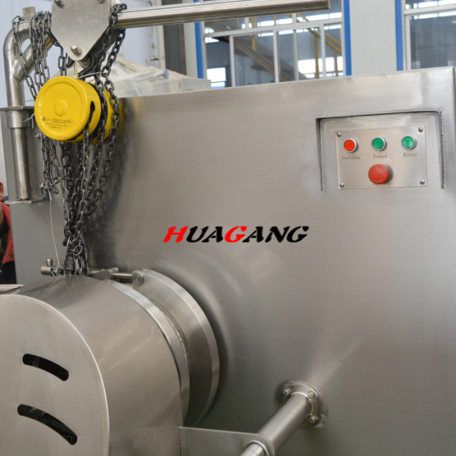 凍肉絞肉機(jī)是肉制品生產(chǎn)行業(yè)中通用性高、使用范圍廣的一種肉食加工設(shè)備。它是依靠螺桿將料斗箱中的原料肉推到預(yù)切板處,通過(guò)螺桿的旋轉(zhuǎn)擠壓使孔板與絞刀產(chǎn)生相對(duì)質(zhì)運(yùn)轉(zhuǎn),從而將原料肉切成顆粒形狀,確保了肉餡的均勻性。通過(guò)孔板的不同組合可達(dá)到理想的要求的不同肉餡。