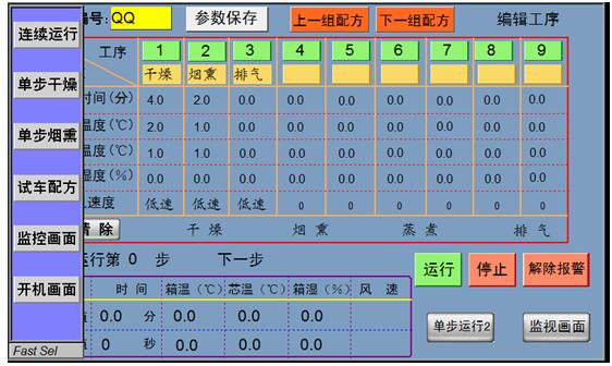香腸煙熏爐點(diǎn)按“工藝選擇”,根據(jù)產(chǎn)品的熏制要求及工藝流程調(diào)整選擇所需要的工藝;同時(shí)調(diào)整好相應(yīng)的溫度和時(shí)間,一般情況下烘干的溫度設(shè)置在70度以內(nèi),蒸煮溫度不過95度;設(shè)定完畢后點(diǎn)按“工藝啟用”,返回后點(diǎn)按“監(jiān)控畫面”,按“始動(dòng)”后設(shè)備即按所設(shè)定啟用的工藝參數(shù)進(jìn)行工作。