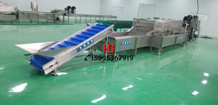清洗機(jī)采用自動(dòng)高壓噴淋系統(tǒng)和泡沫發(fā)生器,通過毛刷與果蔬的直接接觸,既可以清洗果蔬表面的污漬又可以保護(hù)果蔬不受損傷,并將果蔬推入下一加工環(huán)節(jié)。