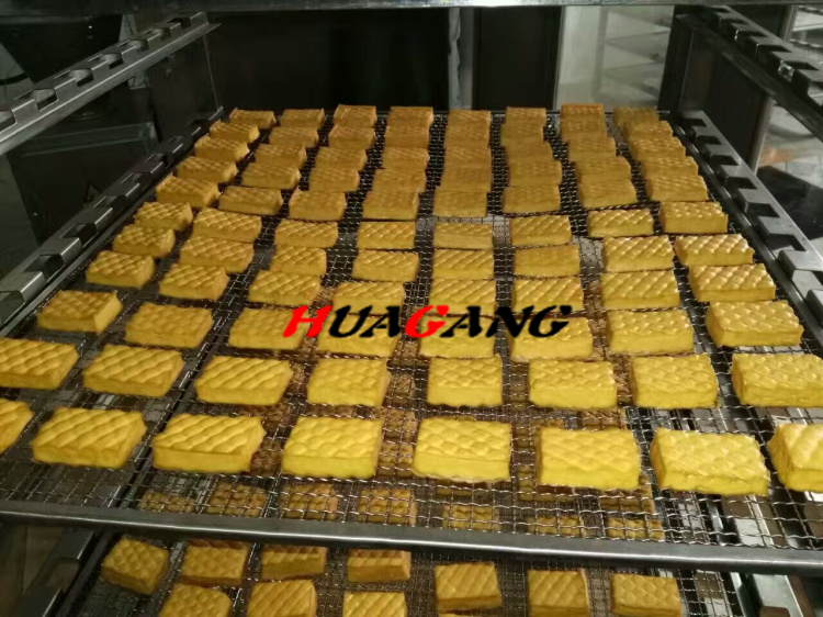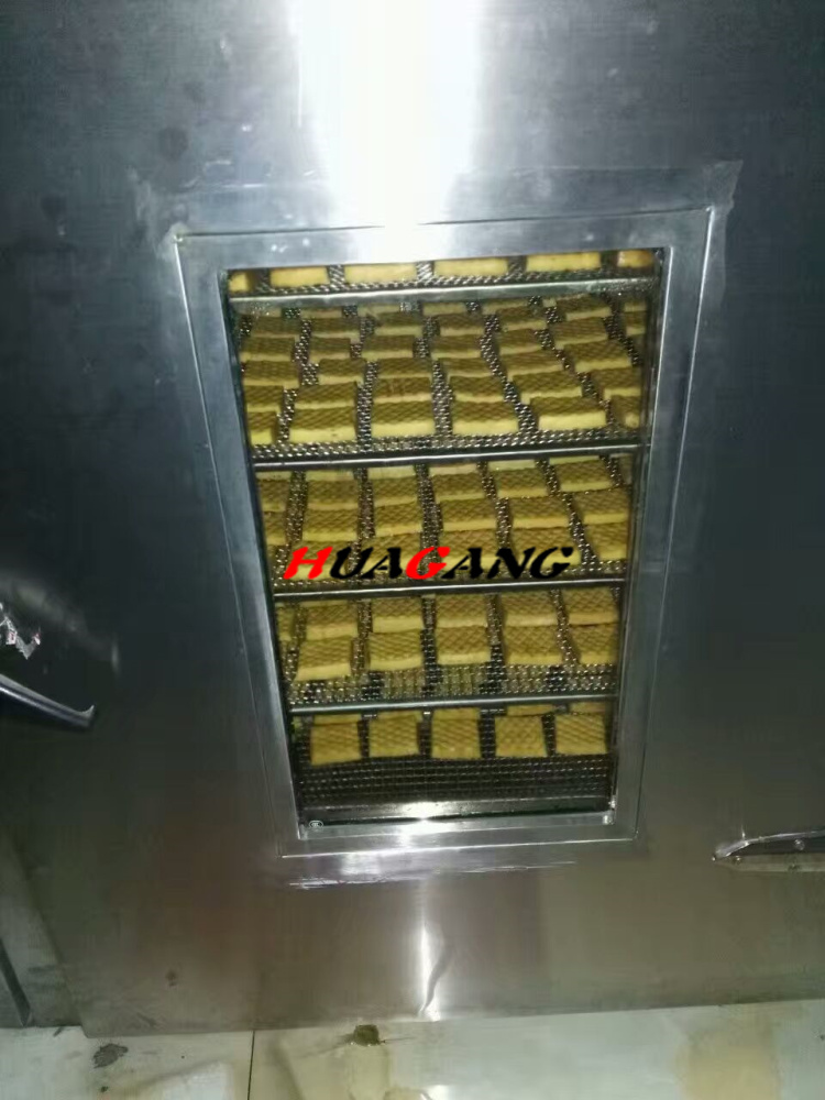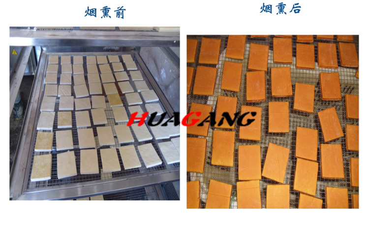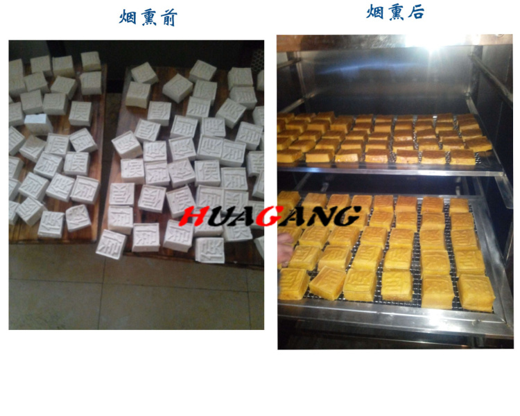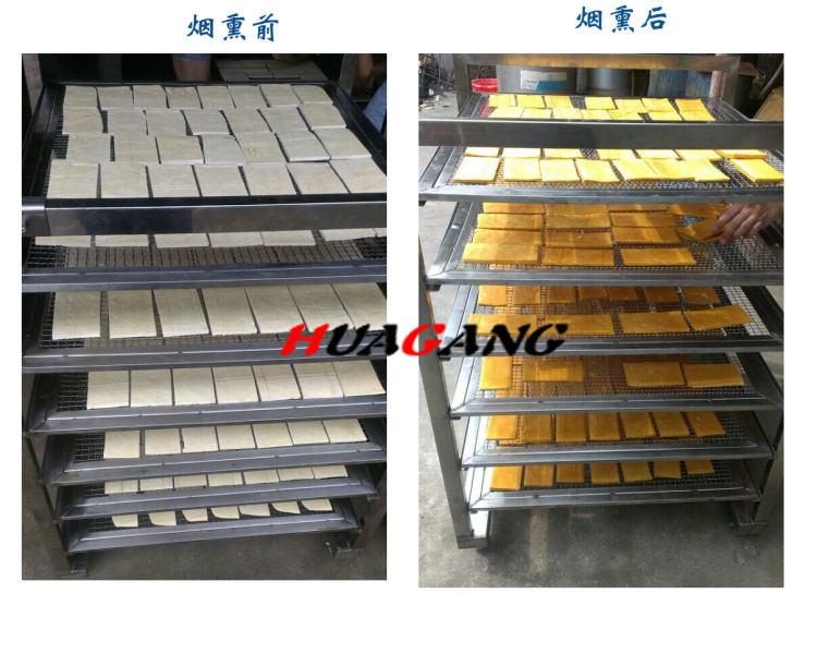1.首先將壓好裁成塊的豆腐干放在我們提供的煙熏推車(chē)托盤(pán)上,一般煙熏推車(chē)根據(jù)型號(hào)和產(chǎn)量上面可放置6-18層不銹鋼盤(pán)子,將每層的盤(pán)子/篩子全部擺滿豆腐干。注意:每塊直接要留一公分的間隙。2.將放滿豆腐干的推車(chē)推到煙熏爐里面。關(guān)上爐門(mén),通過(guò)豆干煙熏爐左側(cè)控制按鈕或者PLC電腦控制面板,設(shè)定溫度和時(shí)間,即可升溫,表皮稍微烘干后打開(kāi)發(fā)煙開(kāi)關(guān),煙霧即可在煙熏爐爐體內(nèi)部煙熏豆腐干。煙熏時(shí)間到后自動(dòng)報(bào)警,關(guān)閉發(fā)煙開(kāi)關(guān),打開(kāi)排煙開(kāi)關(guān),將煙霧排到室外后,打開(kāi)煙熏爐,即可看到煙熏完成的豆腐干。