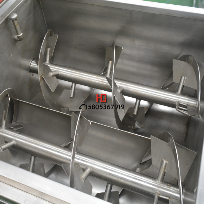 1.采用平行雙軸結(jié)構(gòu),斜板式槳葉,物料在料斗中翻動的同時作圓周運動,使各種物料攪拌的更加均勻。