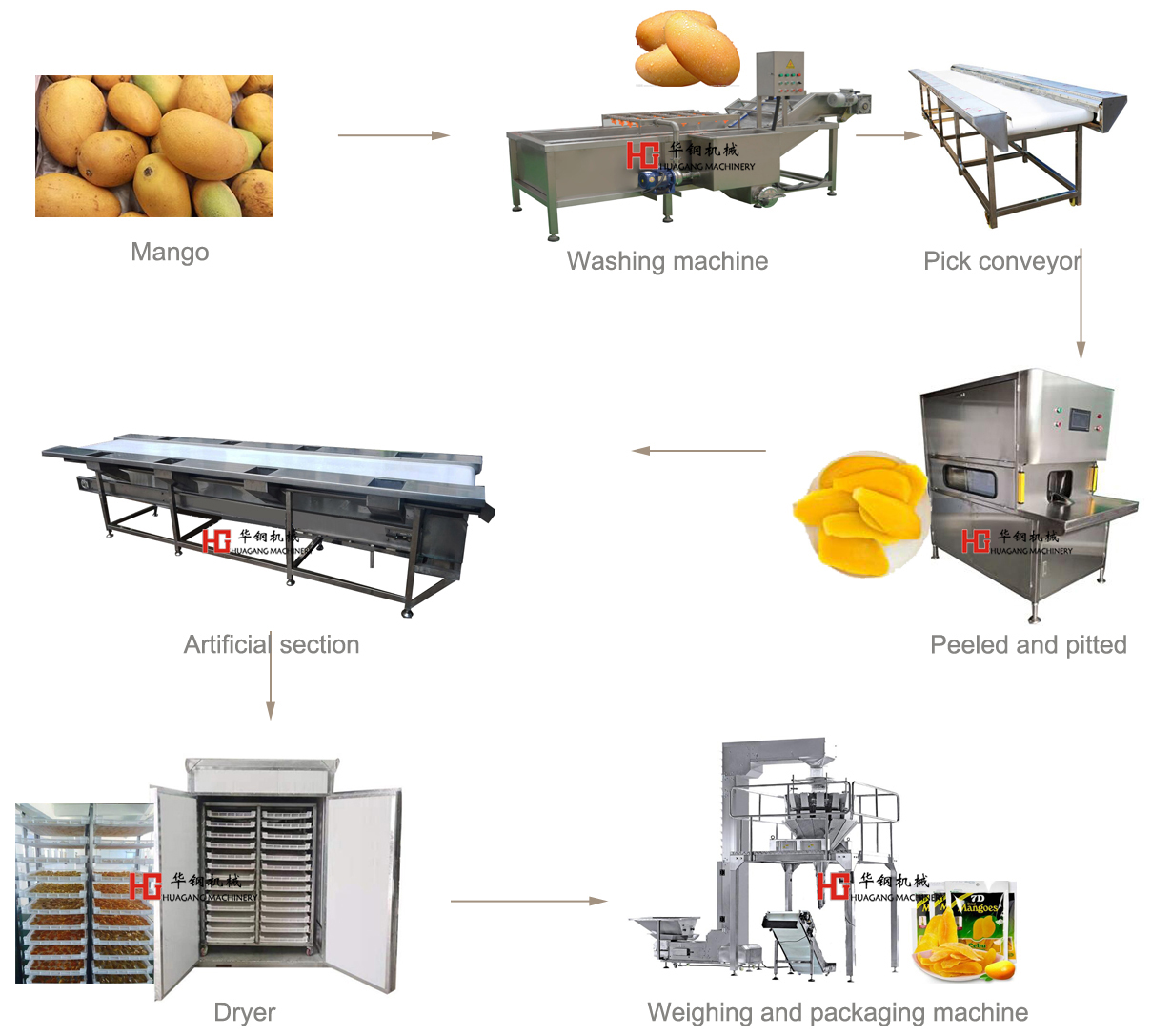 制作芒果干的原料選擇成熟新鮮芒果。首先是肉質(zhì)肥厚才能提高成品率,成熟度以8-9成為宜,成熟度過(guò)低則芒果的色澤和風(fēng)味較差,過(guò)熟則容易腐爛。