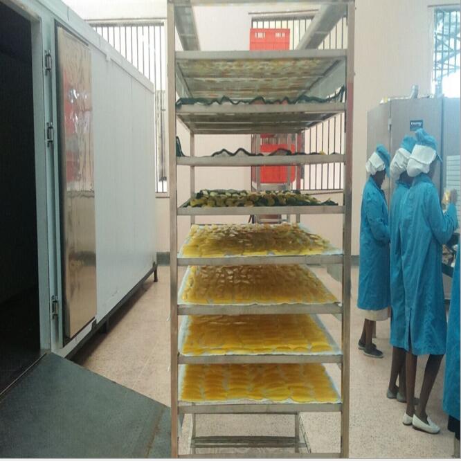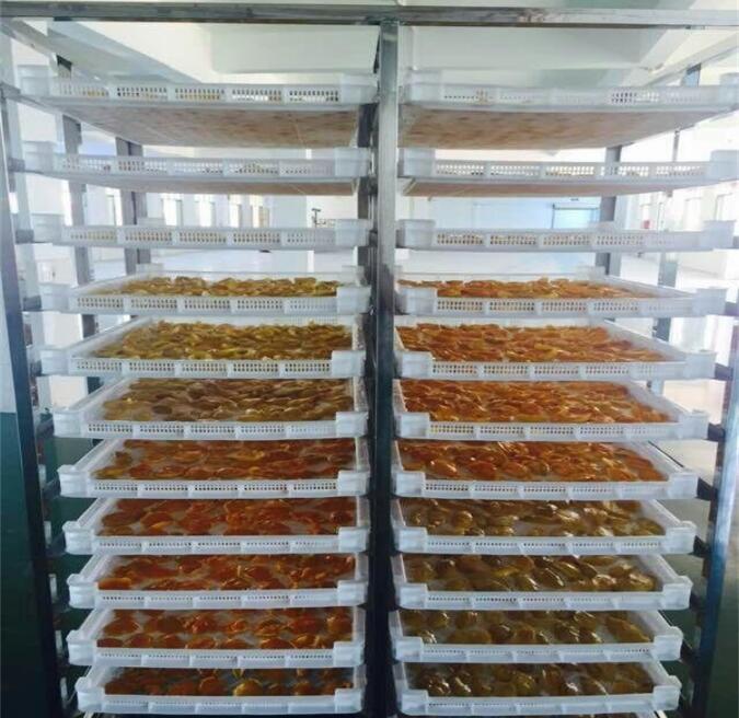 將處理后的芒果原料均勻放于烘干架子(護(hù)色處理的要先瀝干水分),放入熱泵芒果烘干機(jī)房里干燥。干燥初期溫度控制在70-75℃,后期控制在60-65℃,干燥過(guò)程注意翻轉(zhuǎn)、回濕等操作。回軟、包裝待產(chǎn)品達(dá)到干燥要求的水分含量時(shí),一般為15-18%左右,將產(chǎn)品置于密閉容器中,讓其回軟,使各部分含水量均衡,質(zhì)地柔軟,以便包裝。