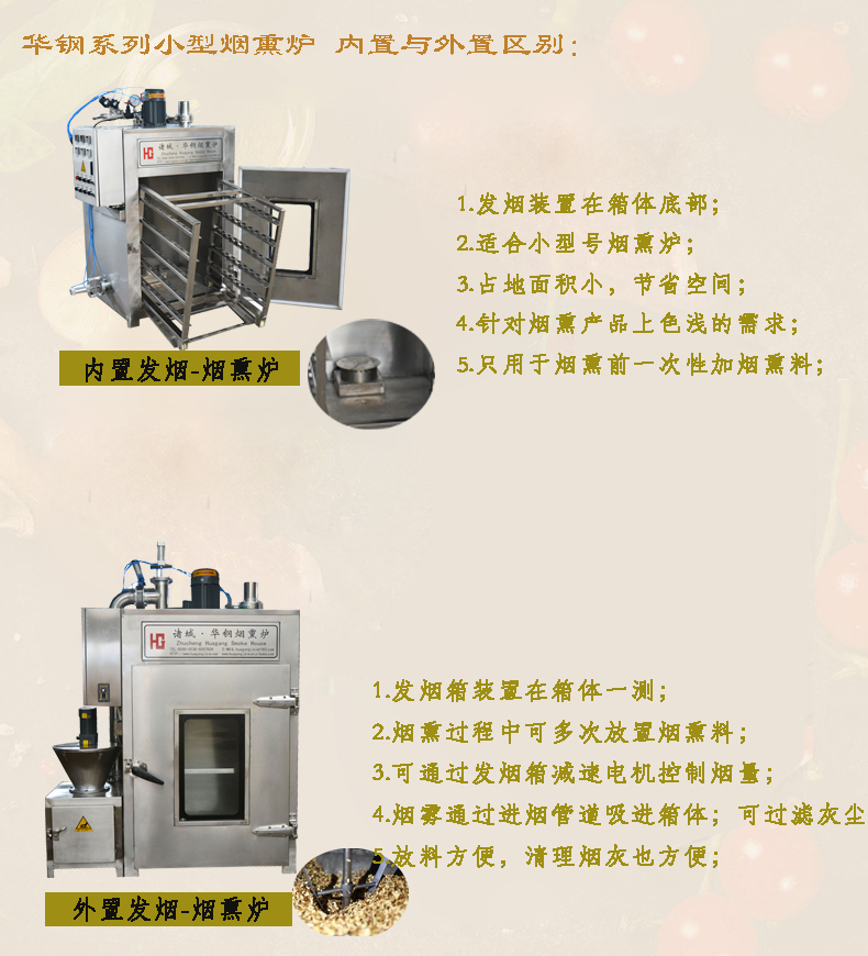諸城華鋼機械生產(chǎn)的煙熏爐可以用于食物的蒸煮,烘干,煙熏,上色,可以用于加工肉制品,豆干制品,還有腸制品,使用范圍廣。型號有30型 50型 100型 150型 200型 1000型可以根據(jù)客戶的需要量身定做。分為內(nèi)置發(fā)煙和外置發(fā)煙,加熱方式有電加熱和蒸汽加熱的兩種。