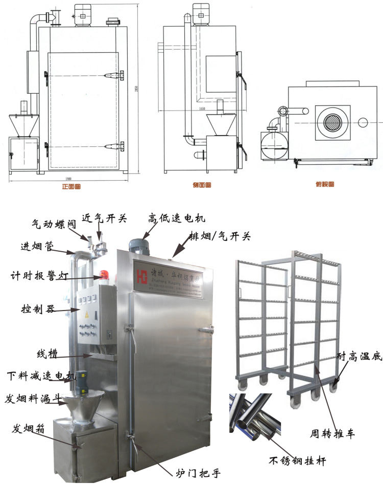 諸城華鋼煙熏爐具有蒸煮、干燥、烘烤、煙熏、排風、烘干等功能。