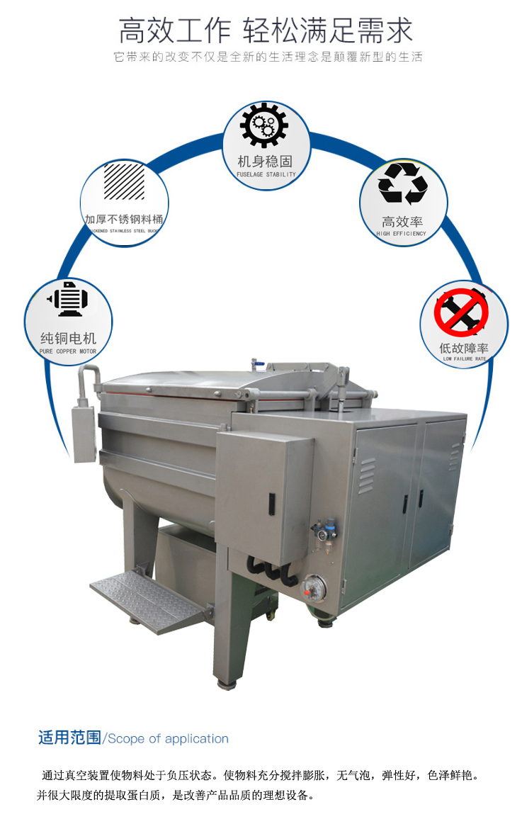 真空拌餡機通過真空裝置使物料處于負(fù)壓狀態(tài)。使物流充分膨脹,無氣泡,彈性好,色澤鮮艷。并大大的限度的提取蛋白質(zhì),是改善產(chǎn)品品質(zhì)的理想設(shè)備。采用平行雙軸結(jié)構(gòu),斜板式槳葉,物料在料斗中翻動的同時作圓周運動,使各種物料攪拌的更加均勻.采用雙速雙動力,根據(jù)所拌餡料的種類及工藝選擇不同的轉(zhuǎn)速和不同的運轉(zhuǎn)方式進(jìn)行攪拌。真空密封裝置全部采用符合衛(wèi)生標(biāo)準(zhǔn)的 密封件。在真空狀態(tài)下,餡料攪拌均勻,充分膨脹,彈性好,色澤鮮艷并大限度地提高蛋白質(zhì)。上蓋及排料門的密封用 硅膠條,操作方便,可靠耐用.