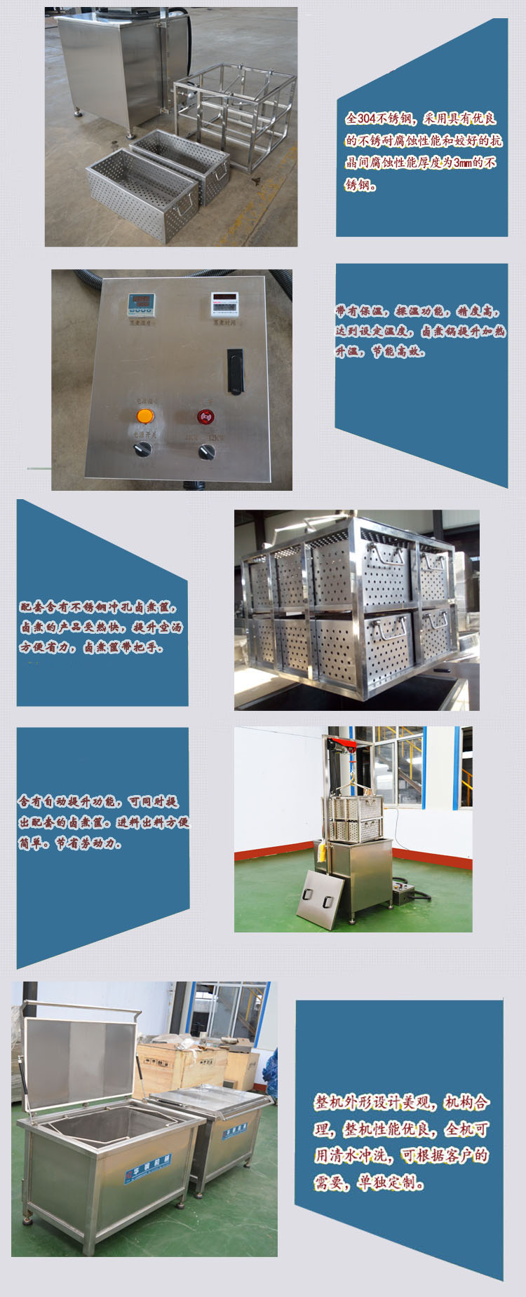 諸城華鋼機械新款方形蒸煮鍋,方形鹵煮槽 自動提升鹵煮鍋以食品級304不銹鋼制作,可滿足不同客戶的不同需求,尺寸可以根據(jù)產(chǎn)量要求定做,可分為電加熱和蒸汽加熱兩種,以及蒸汽/電兩用式;該設(shè)備可選配自動控溫裝置,有效的控制鍋內(nèi)溫度和蒸煮時間,配有內(nèi)筐,產(chǎn)品放在內(nèi)筐內(nèi)蒸煮,衛(wèi)生干凈,方便操作,可自動通過提升裝置把筐提起。鍋外壁帶有保溫層,有效的防止熱量的散發(fā),節(jié)約能源.鍋底有手動閥門,可方便清理;適合大型鹵煮肉制品,雞產(chǎn)品等加工廠選用;