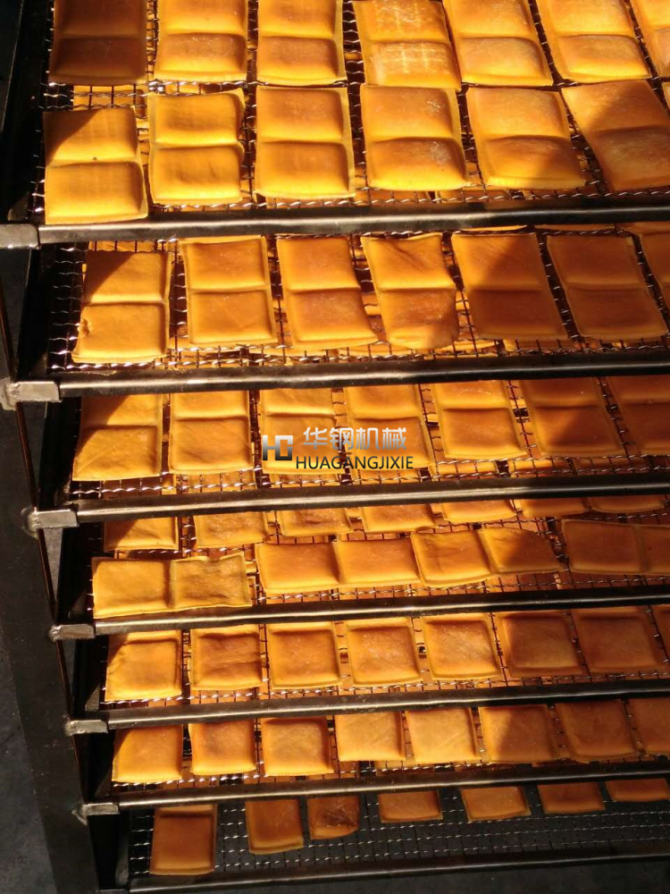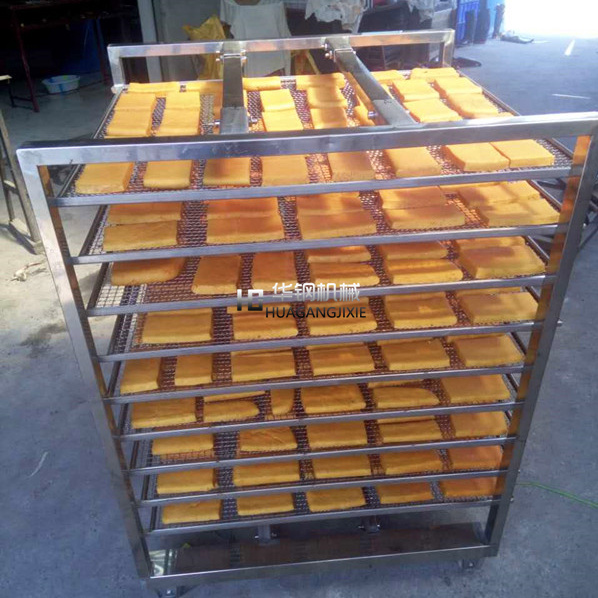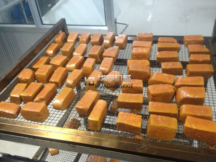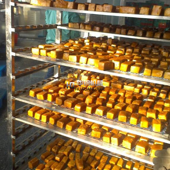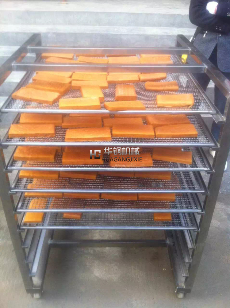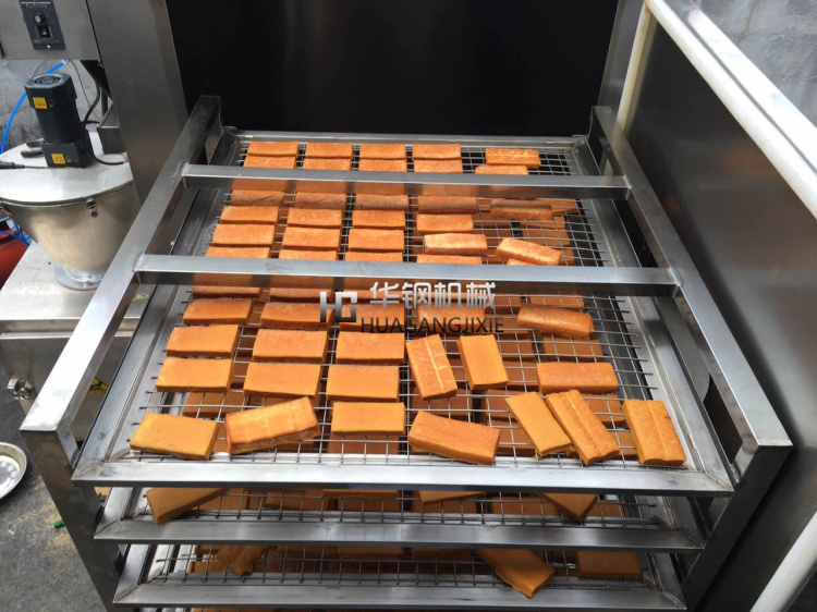 1.首先將壓好裁成塊的豆腐干放在我們提供的煙熏推車托盤上,一般煙熏推車根據(jù)型號(hào)和產(chǎn)量上面可放置6-18層不銹鋼盤子,將每層的盤子/篩子全部擺滿豆腐干。注意:每塊直接要留一公分的間隙。2.將放滿豆腐干的推車推到煙熏爐里面。關(guān)上爐門,通過豆干煙熏爐左側(cè)控制按鈕或者PLC電腦控制面板,設(shè)定溫度和時(shí)間,即可升溫,表皮稍微烘干后打開發(fā)煙開關(guān),煙霧即可在煙熏爐爐體內(nèi)部煙熏豆腐干。煙熏時(shí)間到后自動(dòng)報(bào)警,關(guān)閉發(fā)煙開關(guān),打開排煙開關(guān),將煙霧排到室外后,打開煙熏爐,即可看到煙熏完成的豆腐干。