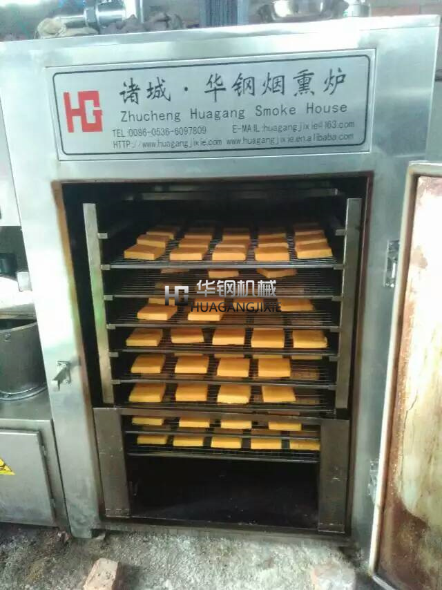 2.將放滿豆腐干的推車推到煙熏爐里面。關(guān)上爐門,通過豆干煙熏爐左側(cè)控制按鈕或者PLC電腦控制面板,設(shè)定溫度和時(shí)間,即可升溫,表皮稍微烘干后打開發(fā)煙開關(guān),煙霧即可在煙熏爐爐體內(nèi)部煙熏豆腐干。煙熏時(shí)間到后自動(dòng)報(bào)警,關(guān)閉發(fā)煙開關(guān),打開排煙開關(guān),將煙霧排到室外后,打開煙熏爐,即可看到煙熏完成的豆腐干。