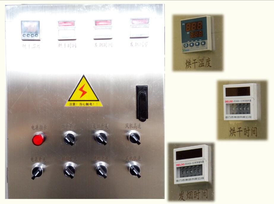 本機(jī)主要由爐體、加熱系統(tǒng)、循環(huán)風(fēng)系統(tǒng)、發(fā)煙系統(tǒng)、及電控系統(tǒng)等組成。