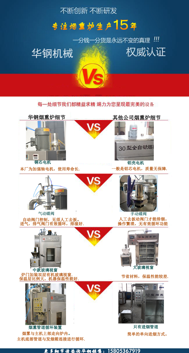 華鋼煙熏爐主要是由爐體、控制箱、發(fā)煙室三部分組成。爐體是進行煙熏上色蒸煮烘干的場所,上部有風扇、銅盤管,風扇的作用是在電機的帶動將吸上來的熱氣、煙霧進行擴散,達到均勻地效果。銅盤管是用于烘干功能時,蒸汽通過蒸汽預留口進入銅盤管內,銅導熱性好,傳熱速度快,并且增大了接觸空間,升溫速度更快,節(jié)能。電加熱管在兩側,升溫速度快,受熱均勻。兩個溫度探頭,一個測爐內溫度一個測食品溫度,外觀的幫助我們判斷產品的熟化狀態(tài)。爐內兩側有獨立煙道,上部設有排氣口、排煙口,側面專門有蒸汽對流口,目的也是保證爐內溫度、煙霧上下一致的效果,避免上下溫度不一致,煙熏色澤不一致的狀況。在爐內的底部設有排水口,排除蒸汽遇冷凝結形成的水珠。