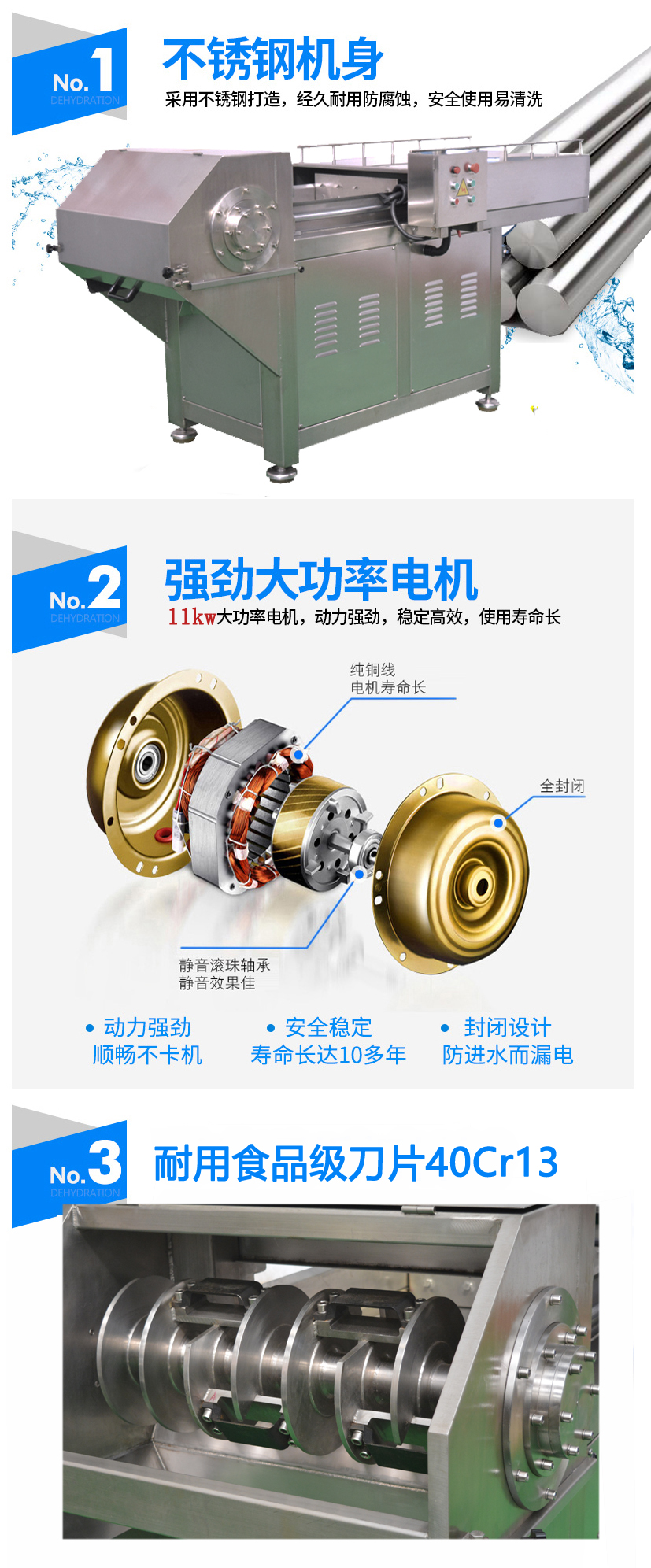 1.加工原料規(guī)格600×400×150/200(mm),每塊2.5~25kg、-4℃~-18℃的凍肉,可直接切成塊狀或片狀,是斬拌機和絞肉機的前道工序。