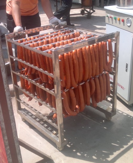 煙熏爐是各種香腸,臘肉,熏雞、烤鴨等肉產(chǎn)品,煙熏豆腐干等不可缺少的設(shè)備之一,具有蒸,烘烤、煙熏、排風(fēng)等功能。根據(jù)客戶的反饋以及市場的需求,經(jīng)過多年的摸索探索研制生產(chǎn),加熱升溫裝置有蒸汽加熱或者電熱管加熱,同時集成了循環(huán)控制,發(fā)煙,烘烤干燥等系統(tǒng),煙熏的過程縮短,提高生產(chǎn)效率;并能控制煙熏料(果木,木屑,稻殼米糠,白砂糖)的量,幫助生產(chǎn)企業(yè)有效控制了成本,對產(chǎn)品進行了性能高,設(shè)備更合理的改進,使其加熱速度、烘干效果、煙熏效果都達到了理想的效果。從而為用戶提供了更、更可靠、更衛(wèi)生和經(jīng)濟的選擇。該設(shè)備整體設(shè)計新穎、加工精制,美觀。整體采用不銹鋼制作,采用耐高溫聚氨酯發(fā)泡材料保溫,保溫效果好、升溫快,節(jié)約能源。該設(shè)備的循環(huán)系統(tǒng)采用雙速循環(huán)風(fēng)機,合理的分配進風(fēng)、排風(fēng)、補風(fēng)機構(gòu),大限度優(yōu)化箱體內(nèi)部氣流循環(huán)狀態(tài),確保整個箱體物料加工過程中可控、均勻,達到了低耗、的產(chǎn)出。而關(guān)于電氣控制方式,該設(shè)備采用可編程控制器及繼電器,電磁閥等關(guān)鍵電氣元件均采用進口產(chǎn)品,操作簡便,可自動控制時間,爐內(nèi)溫度。具有優(yōu)異的發(fā)煙及循環(huán)系統(tǒng),可使?fàn)t內(nèi)的煙霧均勻分布,從而使肉制品著色均勻,色澤美觀,保證產(chǎn)品具有較高的出品率。符合國內(nèi)消費者的消費意識和相關(guān)部門對此類產(chǎn)品在食品安全的相關(guān)規(guī)定。