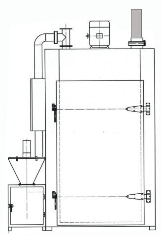 設備由煙熏箱、自動程序控制器、煙霧發(fā)生器、煙熏車四部分組成。關鍵部件是由蒸汽管道、熱交換器和出氣通道組成完善的循環(huán)系統,箱內熏煙與熱氣的混合氣體在兩組循環(huán)風機的作用下,形成渦流區(qū)域,使混合氣體以適宜的速度平衡而均勻地通過懸掛在煙熏箱內的肉制品,使其熟化和滅菌。
