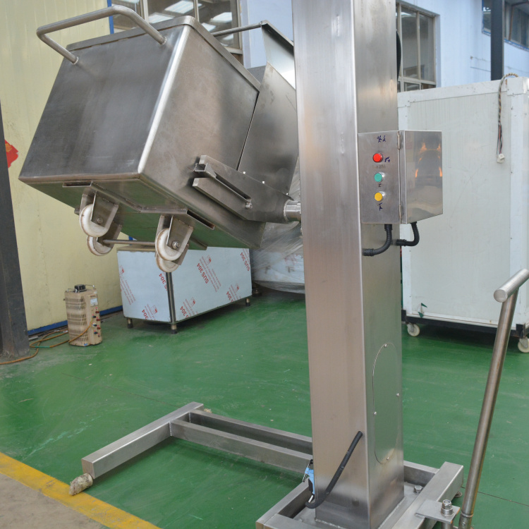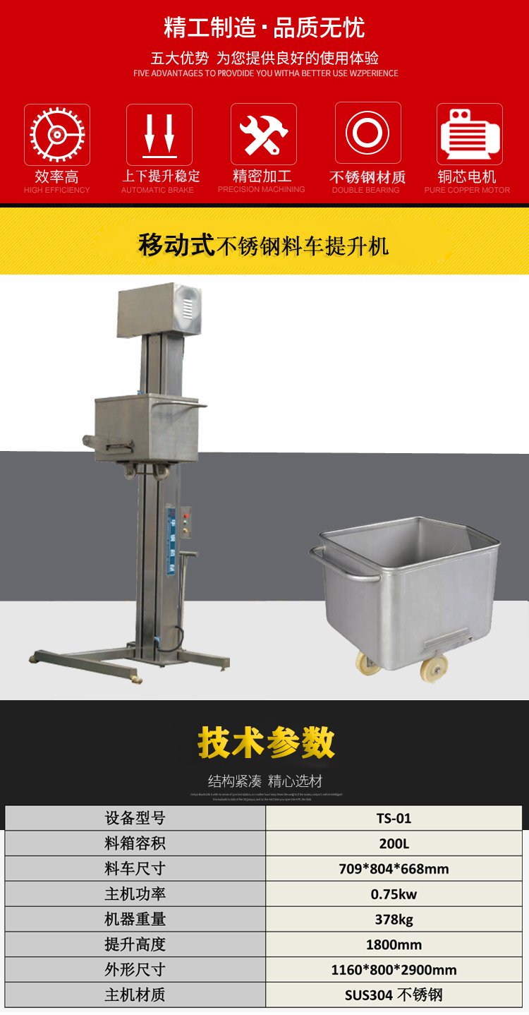 整機(jī)采用不銹鋼材質(zhì),分為移動(dòng)式和固定式兩種機(jī)型,T200型提升機(jī)是專為200L標(biāo)準(zhǔn)肉車配套的提升設(shè)備, 其功能是將物料提升到一定高度后,傾倒至設(shè)備的料斗中,以完成加料工作。該機(jī)采用全不銹鋼材料制造,鏈條傳動(dòng),便于清洗,美觀耐用。。具有運(yùn)行平穩(wěn)、安全可靠、易于清潔、操作方便等優(yōu)點(diǎn),采用進(jìn)口雙行程開關(guān)控制。工藝技術(shù).