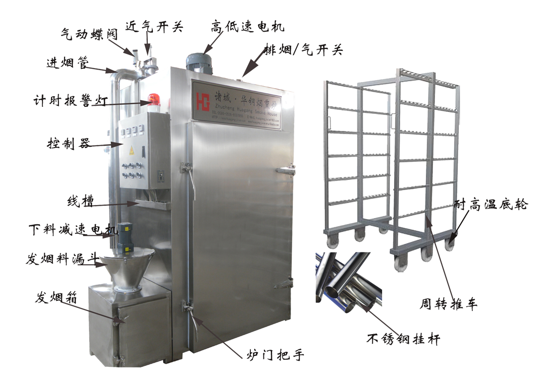 煙熏爐具備熱氣干躁或烤制的作用,蒸煮,煙熏和排氣功能。