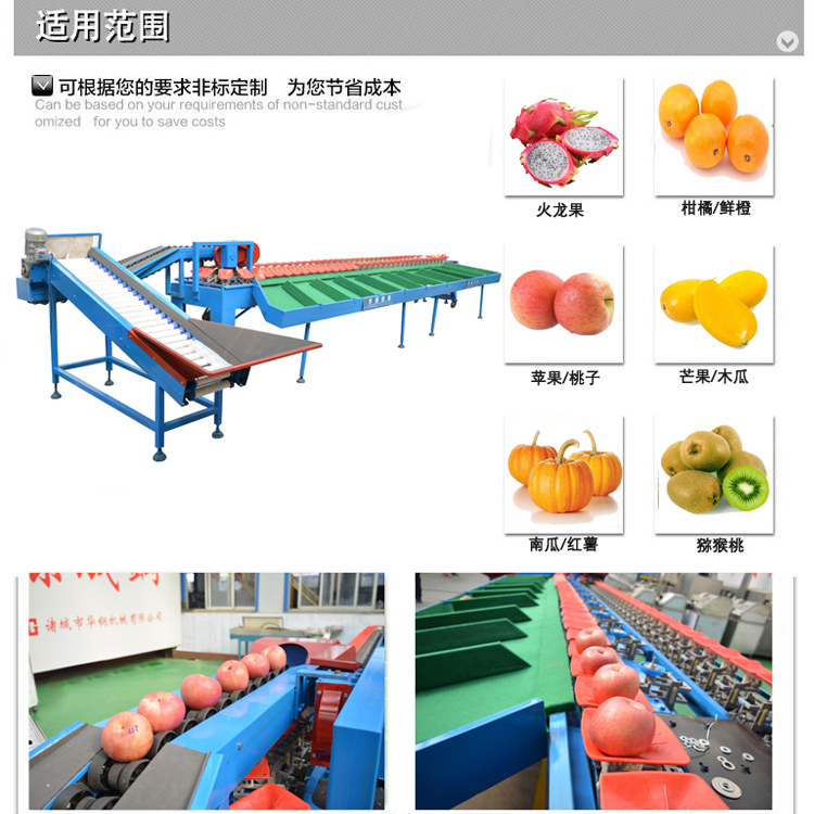 適用范圍:本生產(chǎn)線適用于火龍果、蘋果、橙、桃、杏、梨、蜜柚、檸檬、獼猴桃、石榴等水果。
