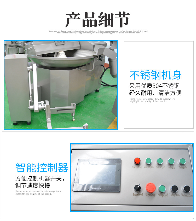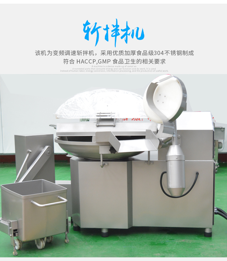 斬拌機(jī)選用不銹鋼作質(zhì)料,其構(gòu)造布局大方漂亮、在操作方面簡(jiǎn)單清潔,達(dá)儀器衛(wèi)生標(biāo)準(zhǔn)技術(shù)、符合加工廠的操作,斬拌機(jī)的高速工作其特色能保證肉制品的斬切細(xì)度,發(fā)熱小,斬切時(shí)間短,進(jìn)步商品的彈性和出品率。斬刀選用進(jìn)口經(jīng)特別技術(shù)加工而成,斬鍋為鑄造全不銹鋼原料。