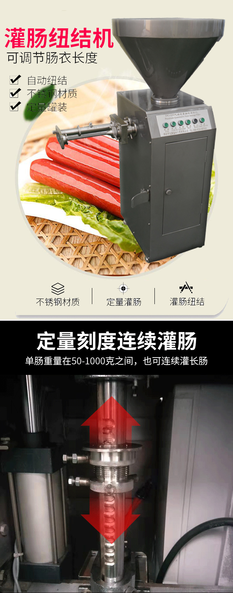 氣動定量扭結(jié)灌腸機外形美觀,小巧玲瓏。與肉食接觸部分及外包裝全部采用不銹鋼制造。易于清洗,定量可在20-500克之間任意可調(diào),誤差僅有3克左右。氣動定量扭結(jié)灌腸機,采用控制閥開關(guān)汽缸來調(diào)整加工產(chǎn)品所屬重量,通過操作面板上按鈕達到控制各個程序動作的目的。該設(shè)備是在定量灌腸機的基礎(chǔ)上加以研制的灌腸設(shè)備,該機既能定量灌腸又能自動扭結(jié),改變了過去定量灌腸扭結(jié)不能一次完成的不足,該機性能穩(wěn)定,操作安全可靠,在原有的基礎(chǔ)上提高了生產(chǎn)效率.
