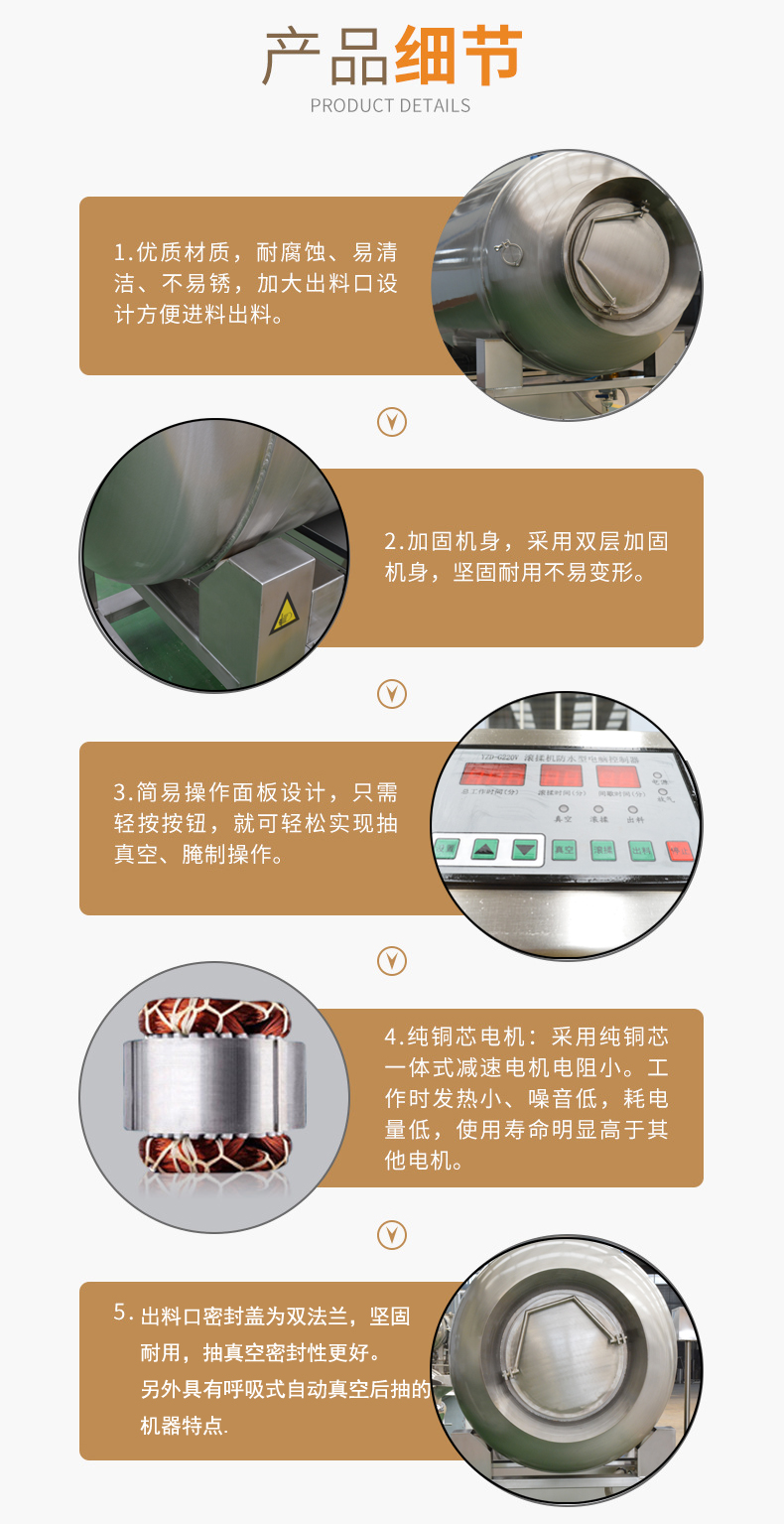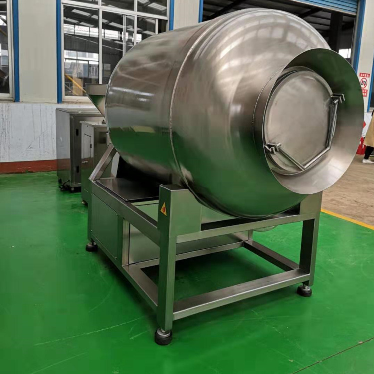 真空滾揉機(jī)是在真空狀態(tài)下,利用物理沖擊原理,讓物料在滾桶內(nèi)上下翻動(dòng),相互撞擊摩擦,產(chǎn)生大面積均勻分布的按摩和腌漬作用,使淹制液在物料內(nèi)均勻分布更加有利于鹽容性蛋白質(zhì)以快的速度限度地淅出,從而增加產(chǎn)品的持水性,很好地改善產(chǎn)品的彈性,切片性和口感,在程度上提高產(chǎn)品的出品率。