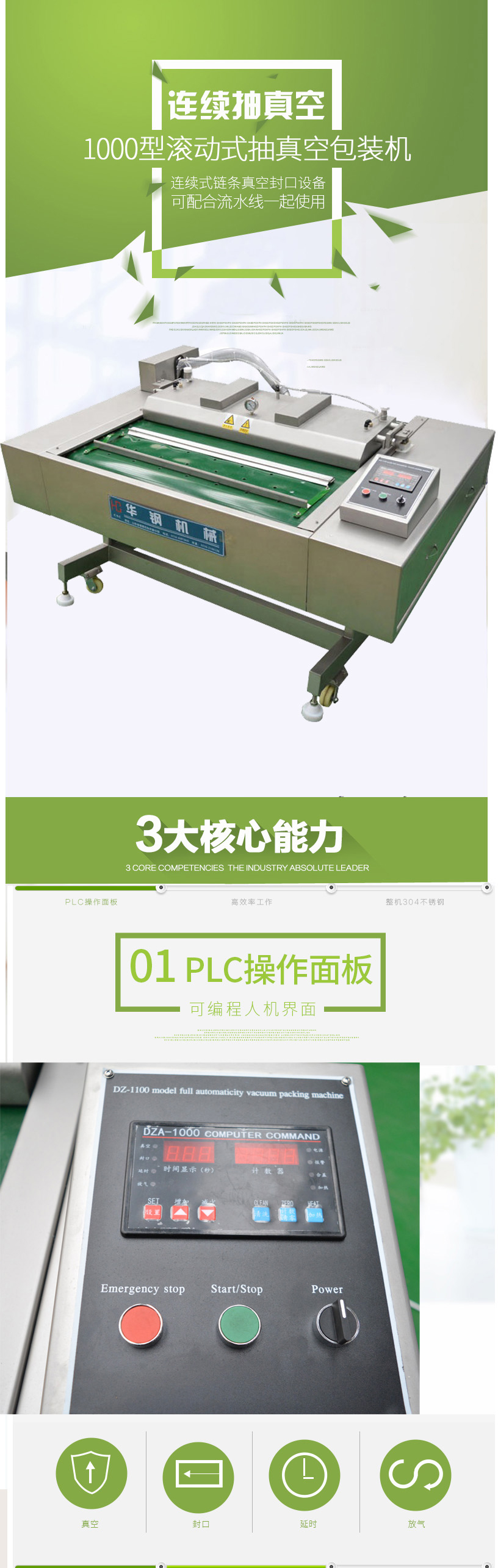 連續(xù)式真空包裝機也叫滾動式真空包裝機,或全自動鏈式真空包裝機。它的工作原理是采用鏈條傳動,自動擺蓋,連續(xù)輸出產(chǎn)品, 整機采用進口PLC可編程邏輯控制器,電腦觸摸屏操作,操作系統(tǒng)全密封,全機可用清水清洗。