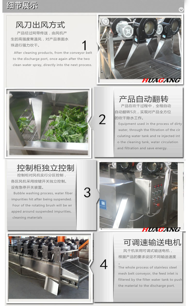 該機特點:有效去除了物料表面水滴,大大縮短了貼標、裝箱的工作時間,適宜流水線作業(yè),提高企業(yè)生產(chǎn)自動化程度。吹干風為常溫,有效保護物料本身的色澤和品質(zhì).