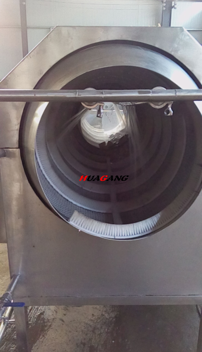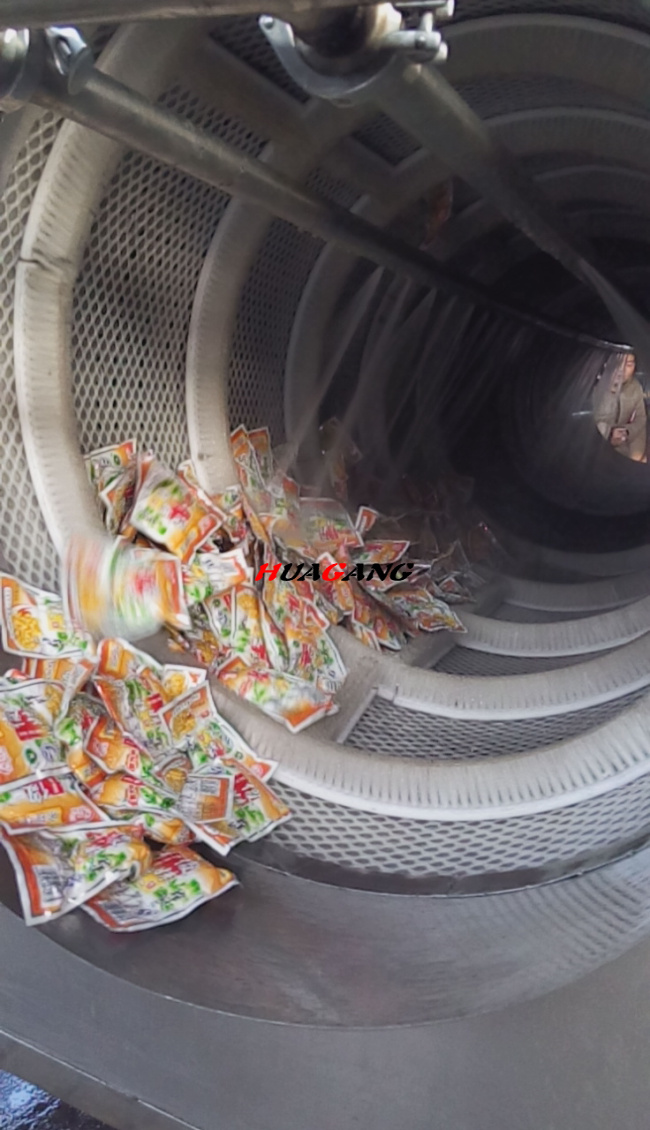 洗袋機(jī)內(nèi)部用毛刷做成螺旋狀,在清洗的過(guò)程中通過(guò)筒體的不斷旋轉(zhuǎn),袋裝食品也隨著不斷轉(zhuǎn)動(dòng),與毛輥不斷接觸對(duì)包裝表面的油污進(jìn)行清洗,內(nèi)部還加入了噴淋不斷沖洗物料。而且清洗段分為兩段清洗,前段可以針對(duì)產(chǎn)品加入一定的清潔劑以及消毒液之類(lèi)的,后段進(jìn)行二次清水清洗。設(shè)計(jì)更加合理與人性化。