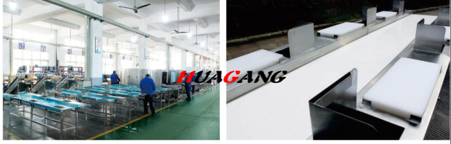 自動流水式工作臺兩邊設有工作崗位,崗位上設置砧板,廢料口,刀具存放槽。標準為三層式,原材料在中層運送,經(jīng)由工人挑選除雜后的良品放到上層; 廢品,爛菜葉,毛發(fā)等雜物通過工作臺廢料口投放到下層輸送帶運至廢品收集車(收集車需要另外定做)。設備參數(shù):