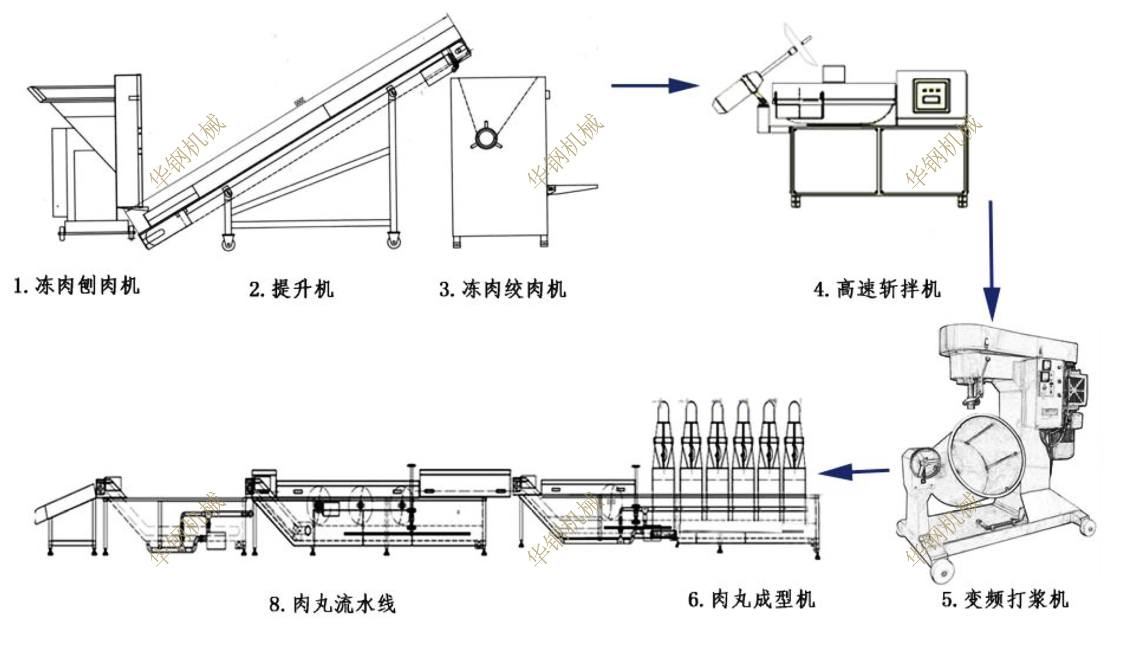 原料預(yù)處理主要包括原料的分割和漂洗。分割的目的是便于下一步原料破碎處理。而漂洗的主要目的是除去原料中阻礙肉糜形 成凝膠體的水溶性蛋白質(zhì)及其他影響品質(zhì)的物質(zhì),如內(nèi)原酶、殘留血液、有色物質(zhì)、殘留脂肪、腥味物質(zhì)、無機鹽和殘留骨屑等,從而提高肉丸成品的總體感官品質(zhì)。 漂洗水溫在10℃以下,用水量為原料肉質(zhì)量的4倍時,是預(yù)處理的工藝。